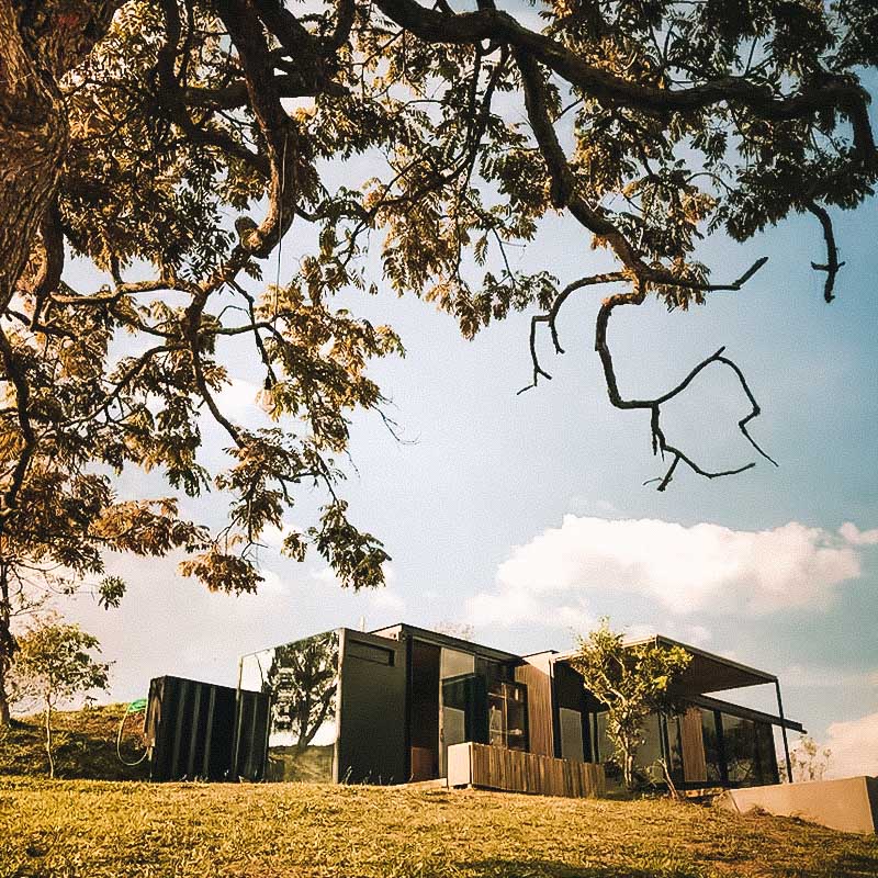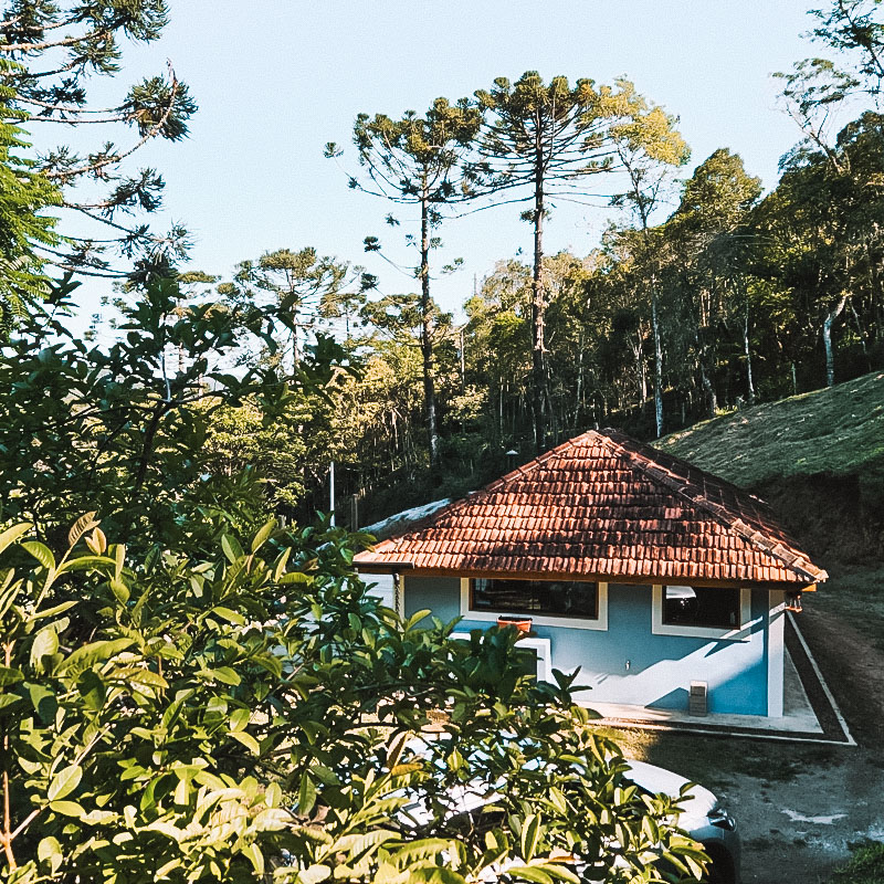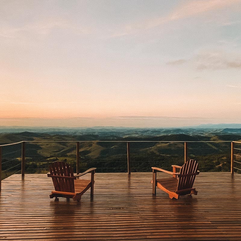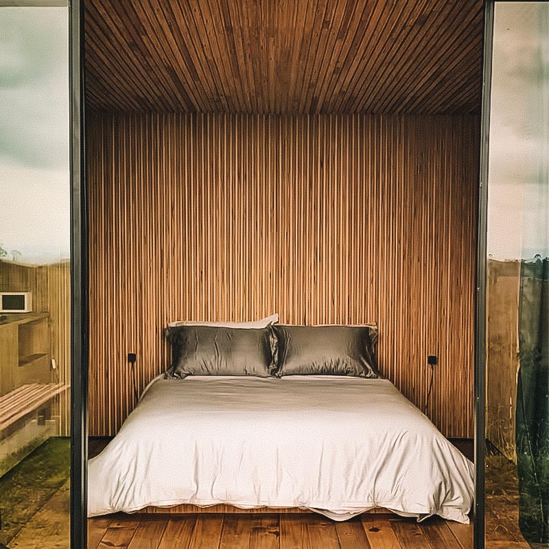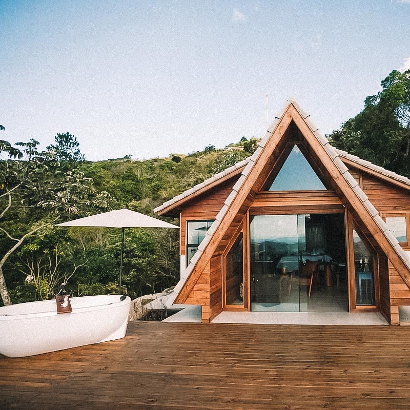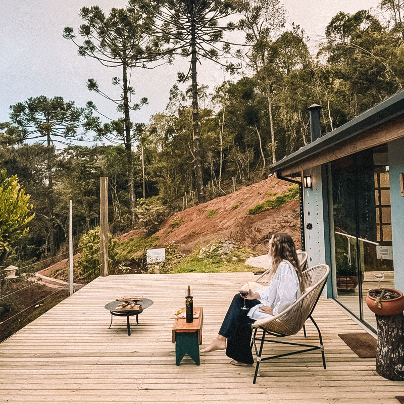 O destaque vai para a arquitetura em madeira e vidro, que integra o interior à natureza e permite admirar as montanhas da Serra do Mar mesmo sem sair do sofá. O espaço interno é aconchegante e funcional: cozinha compacta e completa e quarto aconchegante com vista. No deck de madeira, a experiência se completa com piscina de borda infinita, espreguiçadeiras e firepit para noites românticas sob o céu estrelado. A propriedade ainda oferece nascentes, lagos, trilhas e uma mata exuberante. Diárias desde R$ 780.