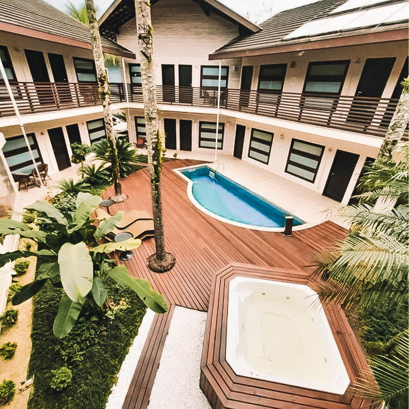 A pousada fica no bairro Jabaquara, a cerca de 300 metros da praia, com vibe rústica, praiana e aconchegante, bem a cara de Paraty. A estrutura conta com piscina ao ar livre, jardim, SPA com opções de massagem e jacuzzi, além de um café da manhã artesanal com bolos caseiros, frutas frescas e produtos da região. São poucas suítes, o que deixa tudo mais tranquilo, incluindo opções com hidromassagem e um loft com cozinha. Os pets são aceitos sem taxa, com limite de até dois por acomodação (porém, não aceitam animais de grande porte). Diárias desde R$ 315.