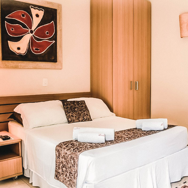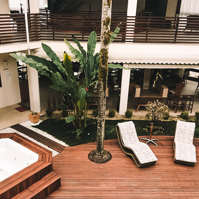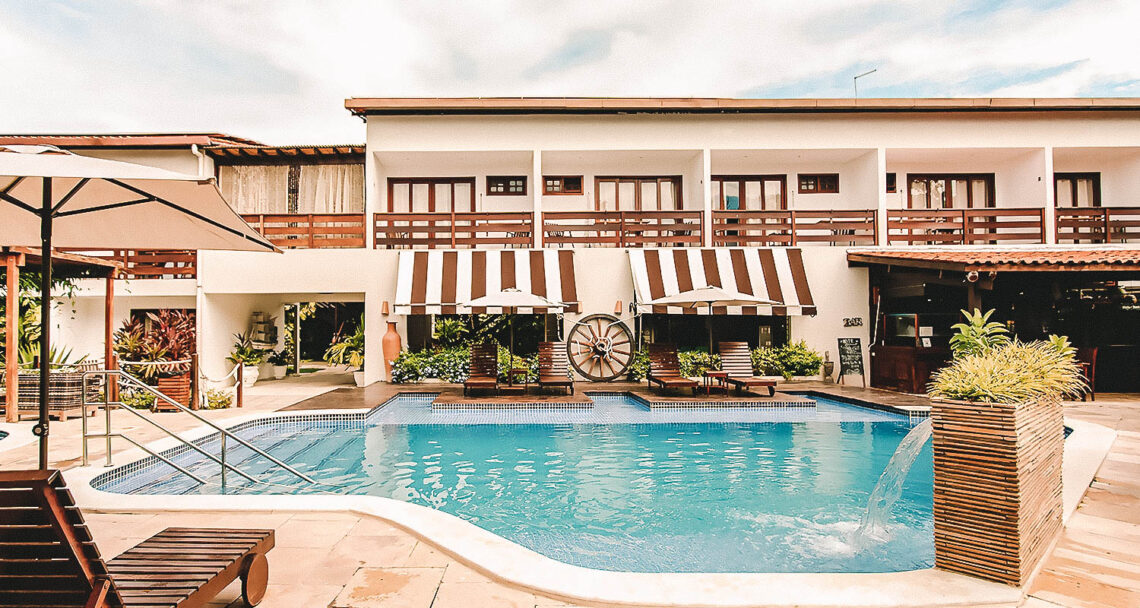 A Pousada L’essence aceita pets de pequeno porte até 8 kg, mas só em uma categoria específica (o Apartamento Luxo Casal com hidro e jardim privativo), por R$ 50. Fica a cerca de 4 km do centro histórico, em uma área mais tranquila e cercada de verde: a parte externa é um dos destaques, com piscina com cascata, deck com espreguiçadeiras, hidromassagem e sauna, tudo integrado. Os quartos seguem uma linha moderna com toque tropical, e alguns ainda têm jardim privativo e banheira. Diárias desde R$ 438.
