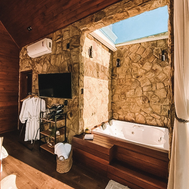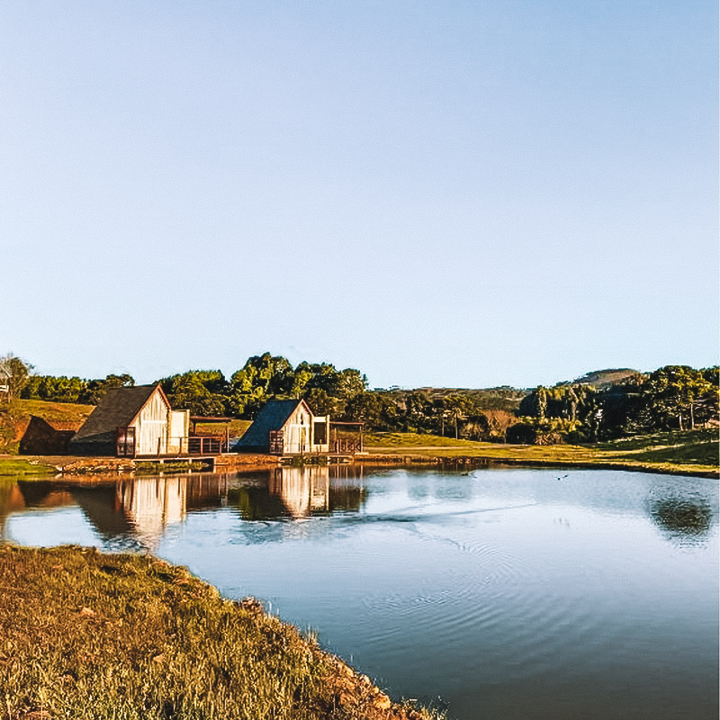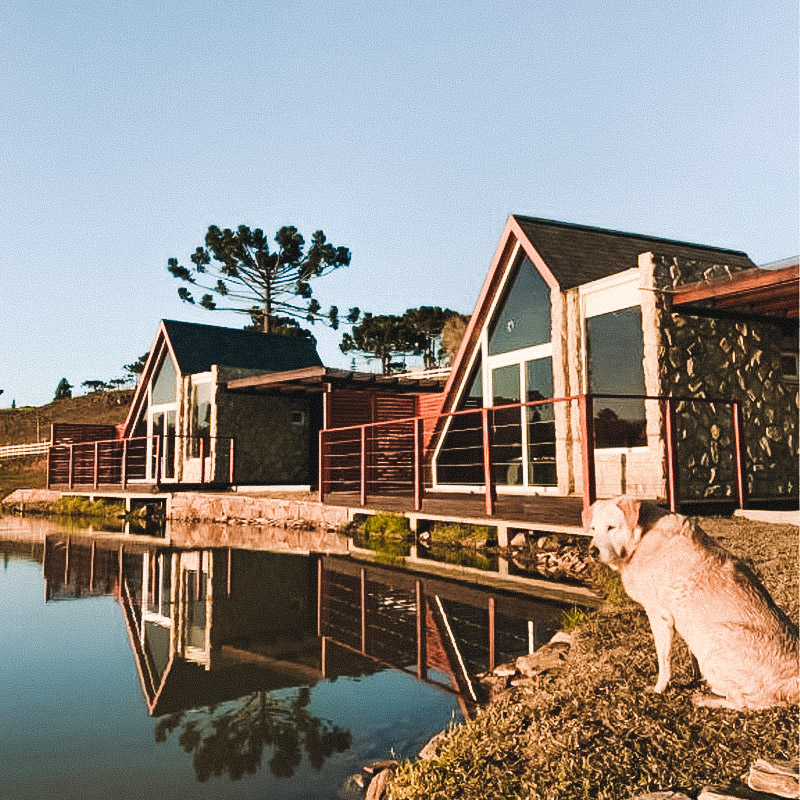 O recanto aposta em cabanas A-frame à beira de um dos lagos da propriedade, oferecendo uma estadia bem estruturada para quem busca conforto em meio à natureza. Você pode levar seu pet de até 10 kg (taxa de R$ 50 por dia). Como o local também tem pets e animais de fazenda, é importante manter seu pet na guia ou sempre por perto nas áreas externas. As unidades têm isolamento térmico e acústico, e um design que combina madeira, vidro e detalhes em pedra. O espaço interior é simplesmente perfeito, com cama queen, mesa para o café da manhã personalizado, banheiro com piso aquecido e uma banheira de hidromassagem com teto de vidro – ideal para observar o céu. O pôr do sol pode ser visto do deck privativo de cada cabana, um dos pontos altos da experiência. Diárias a partir de R$ 967.