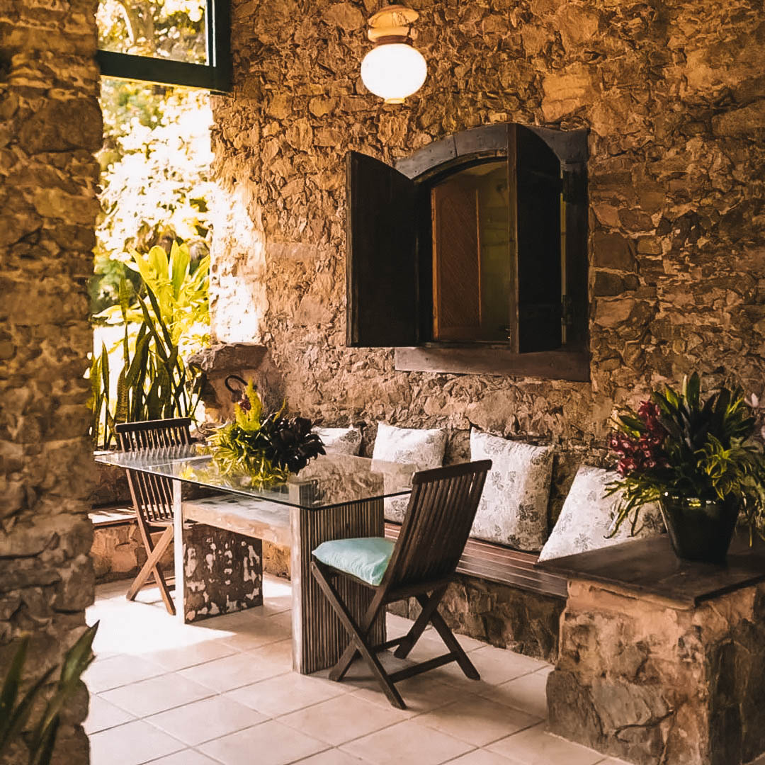 Na mesa propriedade, a Casa de Pedra esbanja charme, construída com materiais típicos coloniais, e design inspirado em casas de uma cidade ao sul da França. Comporta até três pessoas e dispõe da mesma área comun das demais casas, com piscina, gramado e café.
