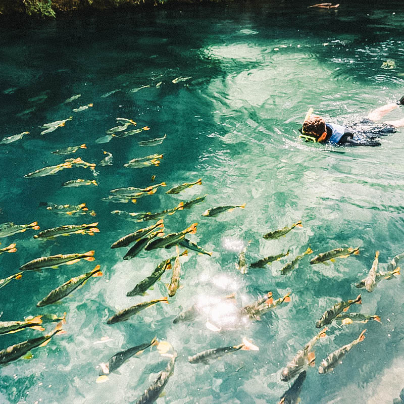 Entre as principais flutuações, o Aquário Natural é ideal para iniciantes, com 600 metros de percurso e treinamento prévio numa piscina, cercado por vegetação abundante. A Nascente Azul é curtinha, com 300 metros, mas impressiona pelo azul turquesa e a fenda submersa perfeita para a apneia, e ainda tem almoço e balneário com tirolesa e cascata. O Rio Sucuri é extenso e famoso: em cerca de 1h, você vê peixes passando ao lado, além de macacos, lontras e jacarés nas margens. Para quem quer o ápice das flutuações, o Rio da Prata, em Jardim, tem 1,4 km de águas rasas, cheias de peixes e nascentes que brotam do leito como pequenos vulcões.