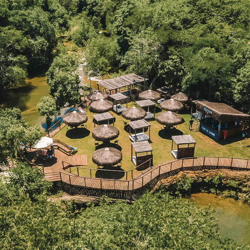 Como o nome diz, a maioria das suítes ficam em cabanas de madeira elevadas. Tem quem venha só passar o dia e participar das atividades, que tem boia-cross e arvorismo. A vantagem é estar colado do Rio Formoso, com a comodidade de curtir essa interação com a natureza sem fazer passeios. Diárias desde R$ 1 139.