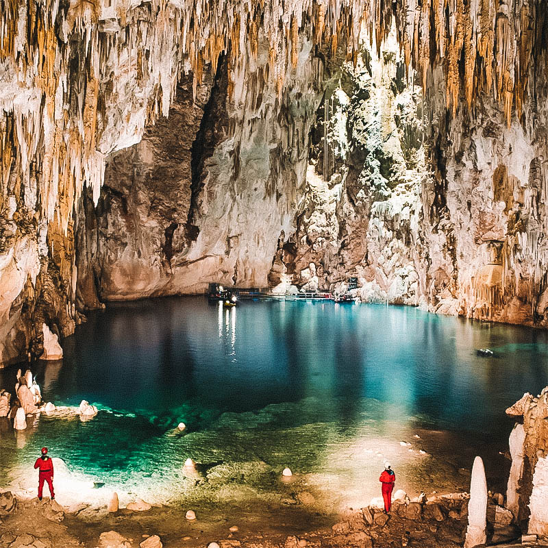 De abril a outubro, a incidência do sol na Lagoa Misteriosa submersa cuja profundidade não se sabe (o máximo alcançado por mergulhadores foi 220 metros), deixa seu azul ainda mais azul que nas flutuações mais azuis. Com visibilidade de até 50 metros, você pode relaxar flutuando ou mergulhando com cilindro se tiver o certificado PADI Open Water – rende as fotos subaquáticas mais impressionantes. O Abismo Anhumas já é o mais desafiador dos passeios, recomendado apenas pra quem está com ótimo preparo físico. Começa com um rapel de 3 metros até a abertura da cratera, seguido de outros 72 metros em negativo até um lago cristalino, onde se faz flutuação ou mergulho com cilindro, com profundidade de 18 metros.