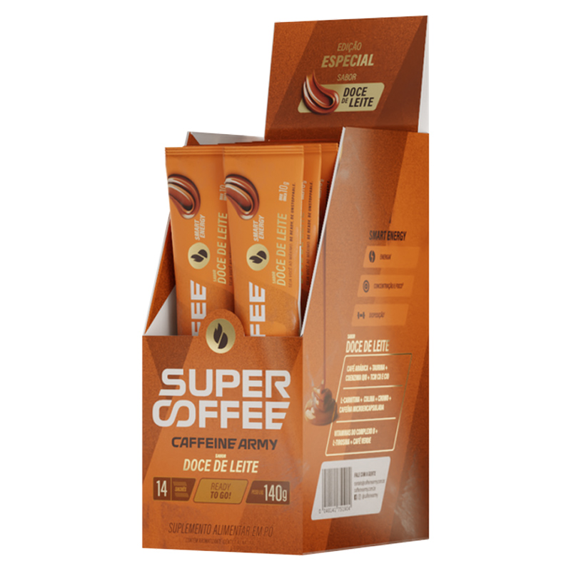 O SuperCoffee Doce de Leite é o último lançamento da Caffeine Army, resultado de uma demanda do consumidor pelo sabor docinho e familiar da nossa cozinha. Mesma fórmula, mesmo efeito, mesma performance dos outros sabores, só que agora com o um fundinho leve e tradicional do doce de leite. A experiência já começa pelo cheiro característico e melhora quando misturado com leite, água ou como base em receitas básicas, como o smoothie de banana.