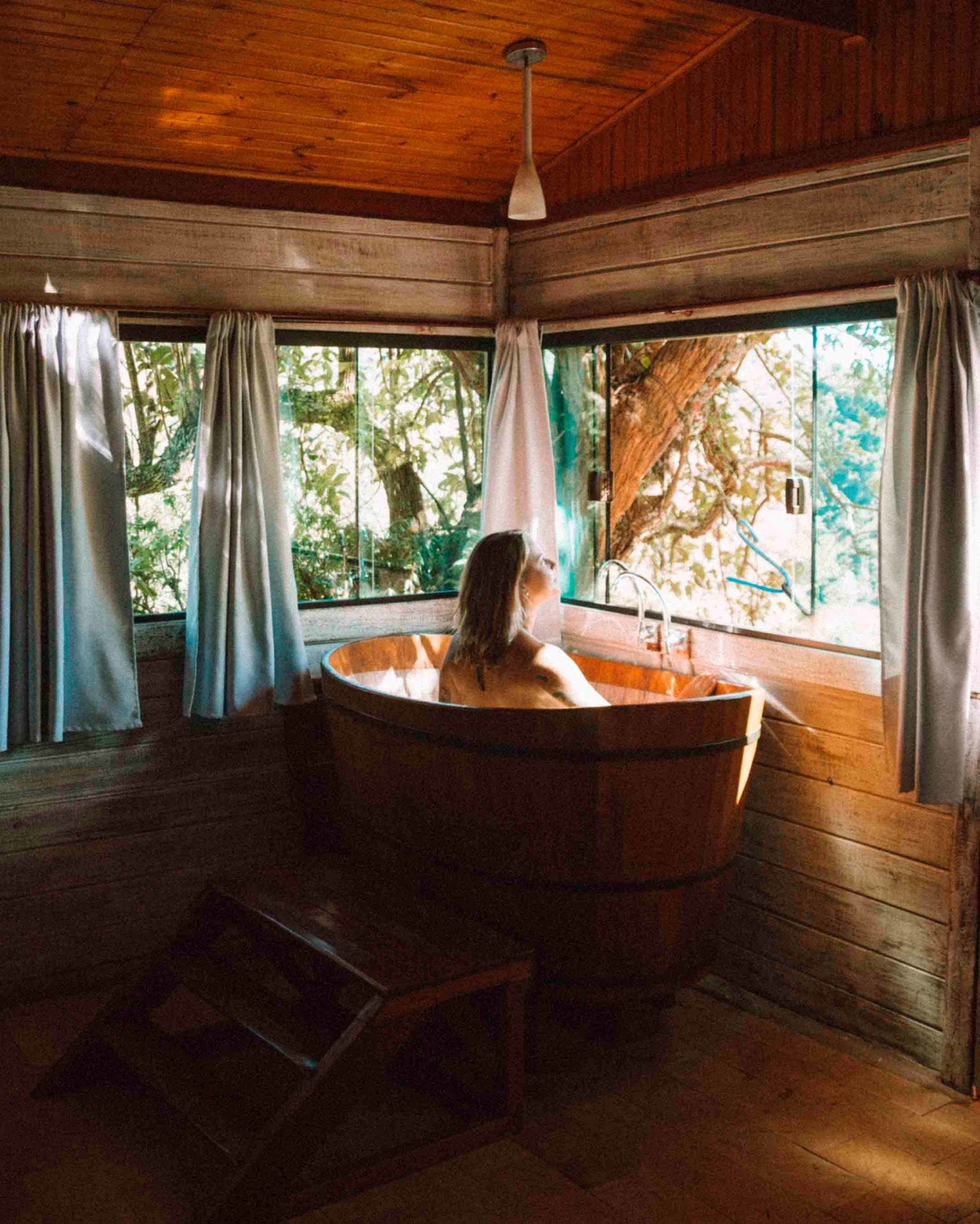 Os chalés parecem ser feitos para você querer ficar dentro deles o máximo de tempo possível. A lenha da lareira é resposta constantemente para aquecer o espaço, o jantar pode ser servido ali  mesmo, roupões felpudos e garrafas de vinho também são providenciados. Para passar o dia em modo da sauna pro ofurô, do ofurô pra piscina, da piscina para rede; repete. Se precisar de alguma coisa, é só chamar no WhatsApp que eles levam para você.