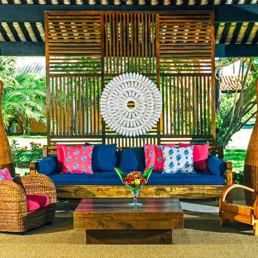 O coco servido numa cestinha fofa no check-in já revela a atenção aos detalhes e o serviço simpático do hotel. A decoração do lobby é linda, com paredes azuis e móveis e artesanatos de palha, bambu e madeira de demolição. Um carrinho de golfe te leva aos quartos com as malas pelas passarelas que deixam ver o paisagismo bem-cuidado do jardim e as plaquinhas indicando animais que vivem por ali; cheguei a ver uns micos pulando nos galhos umas duas vezes. As acomodações mais simples são as “premium”, com 38 m², detalhes em azul-piscina, cabeceira de madeira banheiros grandes. Gosto do fato de que todas (de todas as categorias) têm varandas espaçosas com redes – foi maravilhoso botar meu roupão e ler um livro no fim da tarde ali. Pra quem tem bala, as “pool villas” com três quartos e piscina privativa oferecem uma oportunidade de alugar casa de praia e ao mesmo tempo ter serviços e estrutura de hotel.