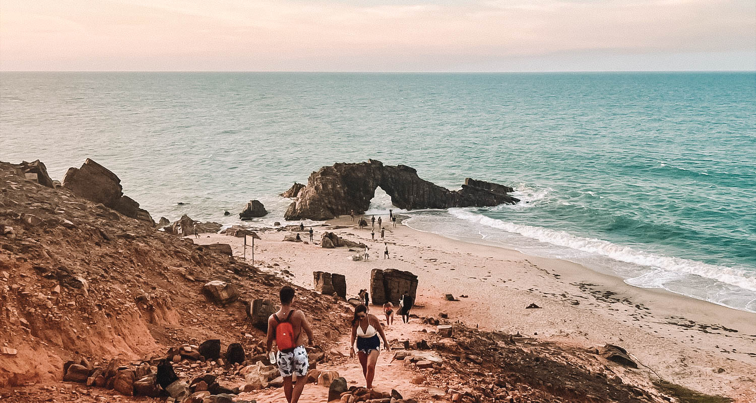 Um dos cartões-postais mais famosos do Ceará, a Pedra Furada é o ponto final de uma trilha que mistura mar, pedras e muita beleza natural. O percurso de quase 6 km passa pelo Poço da Princesa, uma piscina natural formada pelas ondas do mar, pela Praia da Malhada e pela própria Praia de Jericoacoara. Apesar de ser considerado fácil e levar em média 1h20 para ser concluído, o caminho é todo aberto, sem sombra, o que exige bastante atenção nos dias quentes (leve protetor solar!). Também é importante verificar a tábua de marés: em maré alta, o trecho pela praia se torna inviável – as pedras podem ser escorregadias. Na chegada à Pedra Furada, a recompensa: o paredão imenso com a cavidade no meio e as ondas batendo ao fundo cria um cenário impressionante.